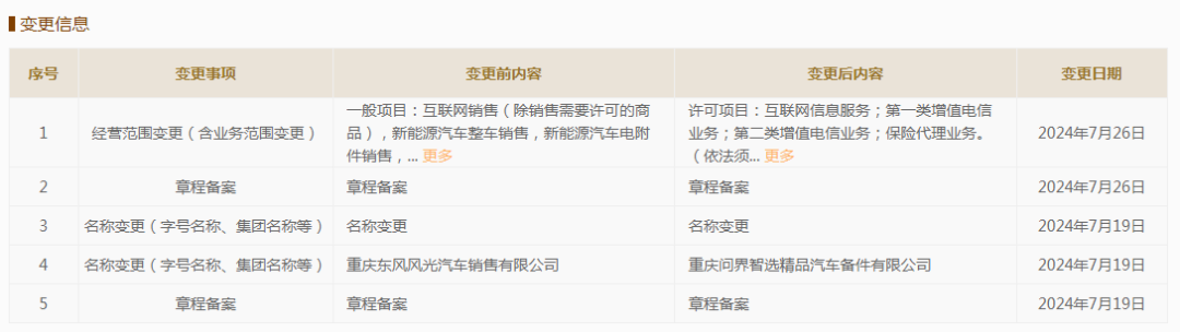 “V观财报”查阅资料发现,“重庆东风风光汽车销售有限公司”7月19日名称也变更为“重庆问界智选精品汽车备件有限公司”,该公司注册资本3000万元,经营范围包括新能源汽车整车销售等。赛力斯全资持股的赛力斯汽车(湖北)有限公司100%持股该公司。