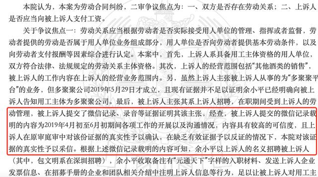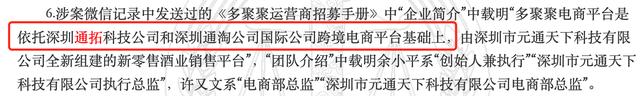 判决书显示,余国翠为元通天下员工。该份判决书涉及元通天下前员工和元通天下之间的劳动合同纠纷,其中披露了部分元通天下与通拓科技的业务关联:涉案微信记录中发送过的《多聚聚运营商招募手册》中“企业简介”中载明“多聚聚电商平台是依托深圳通拓科技公司和深圳通淘公司国际公司跨境电商平台基础上,由深圳市元通天下科技有限公司全新组建的新零售酒业销售平台”。深圳市中院也对微信记录的真实性予以采信。
