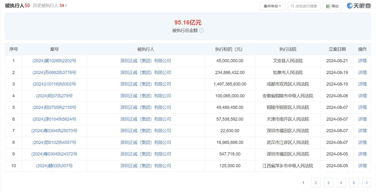 据天眼查,8月19日-21日,深圳正威(集团)新增了3条被执行信息,执行标的合计17.78亿元。仅2024年8月以来,深圳正威(集团)的被执行信息就多达12条。截至发稿前,深圳正威(集团)仍现存50条被执行人信息,被执行金额高达95.16亿元。