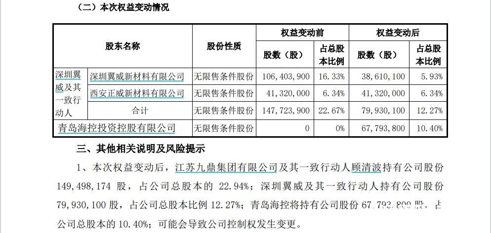 根据公告,江苏九鼎集团有限公司及其一致行动人顾清波(简称“九鼎系”)持有公司股份1.49亿股,占比为22.94%;深圳翼威及其一致行动人(简称“正威系”)持有0.80亿股,此次权益变动后,其持有公司股份占比从22.67%下降到12.27%。