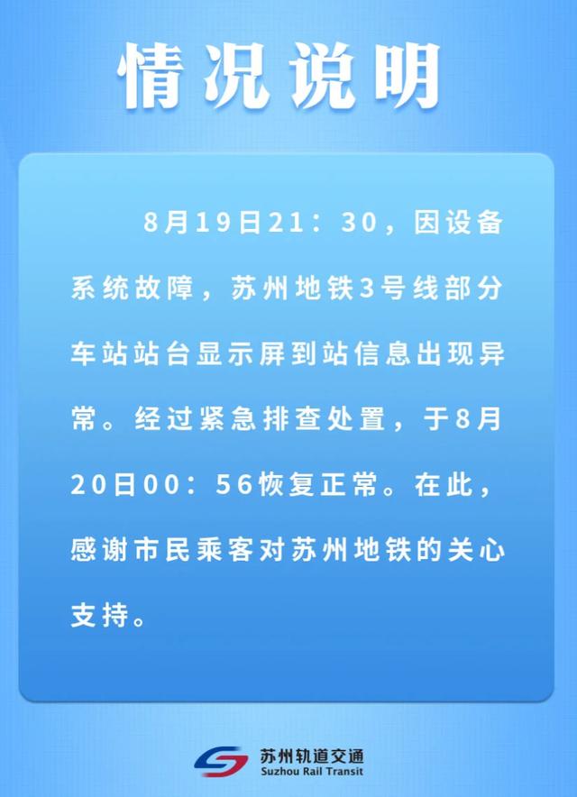 8月20日下午,苏州地铁发布了《关于3号线部分车站到站信息异常的情况说明》,称8月19日21:30,因设备系统故障,苏州地铁3号线部分车站站台显示屏到站信息出现异常。经过紧急排查处置,于8月20日00:56恢复正常。