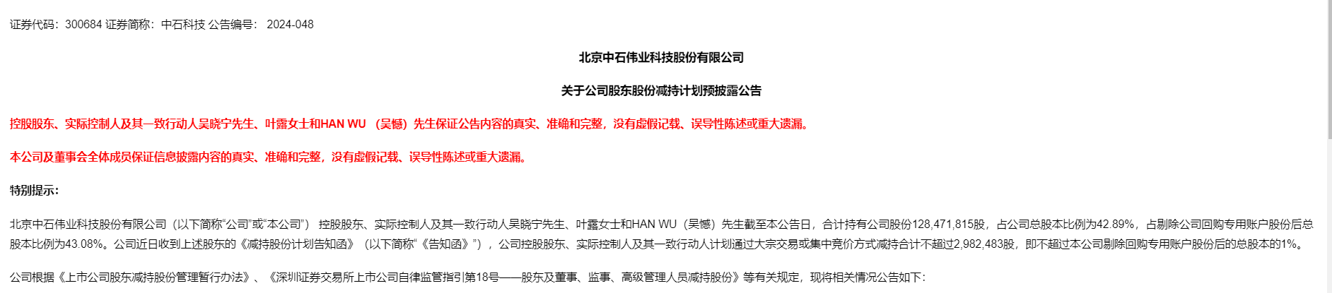 中石科技8月21日晚间公告,公司控股股东、实际控制人及其一致行动人吴晓宁、叶露和HANWU(吴憾)合计持有公司42.89%股份,占剔除公司回购专用账户股份后总股本比例为43.08%,上述股东计划通过大宗交易或集中竞价方式减持合计不超过298.25万股,即不超过本公司剔除回购专用账户股份后的总股本的1%。减持原因为个人资金需求。减持期间自本公告披露之日起15个交易日后的三个月内。
