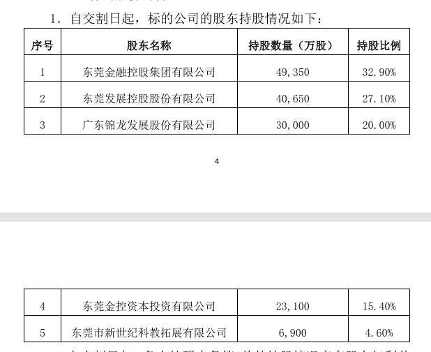 截至8月14日,上述挂牌信息披露期满,收到上海产交所出具的《竞价结果通知》和《组织签约通知》,此次交易共征集到1名符合条件的意向受让方,为东莞金融控股集团有限公司(简称“东莞金控集团”)和东莞发展控股股份有限公司(简称“东莞控股”)组成的联合体,东莞联合体已按要求向上海产交所交纳了3000万元保证金。