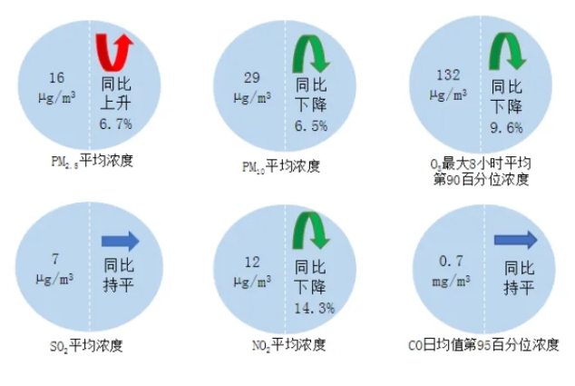 7月,全国339个地级及以上城市PM2.5平均浓度为16微克/立方米,同比上升6.7%;PM10平均浓度为29微克/立方米,同比下降6.5%;O3平均浓度为132微克/立方米,同比下降9.6%;SO2平均浓度为7微克/立方米,同比持平;NO2平均浓度为12微克/立方米,同比下降14.3%;CO平均浓度为0.7毫克/立方米,同比持平。