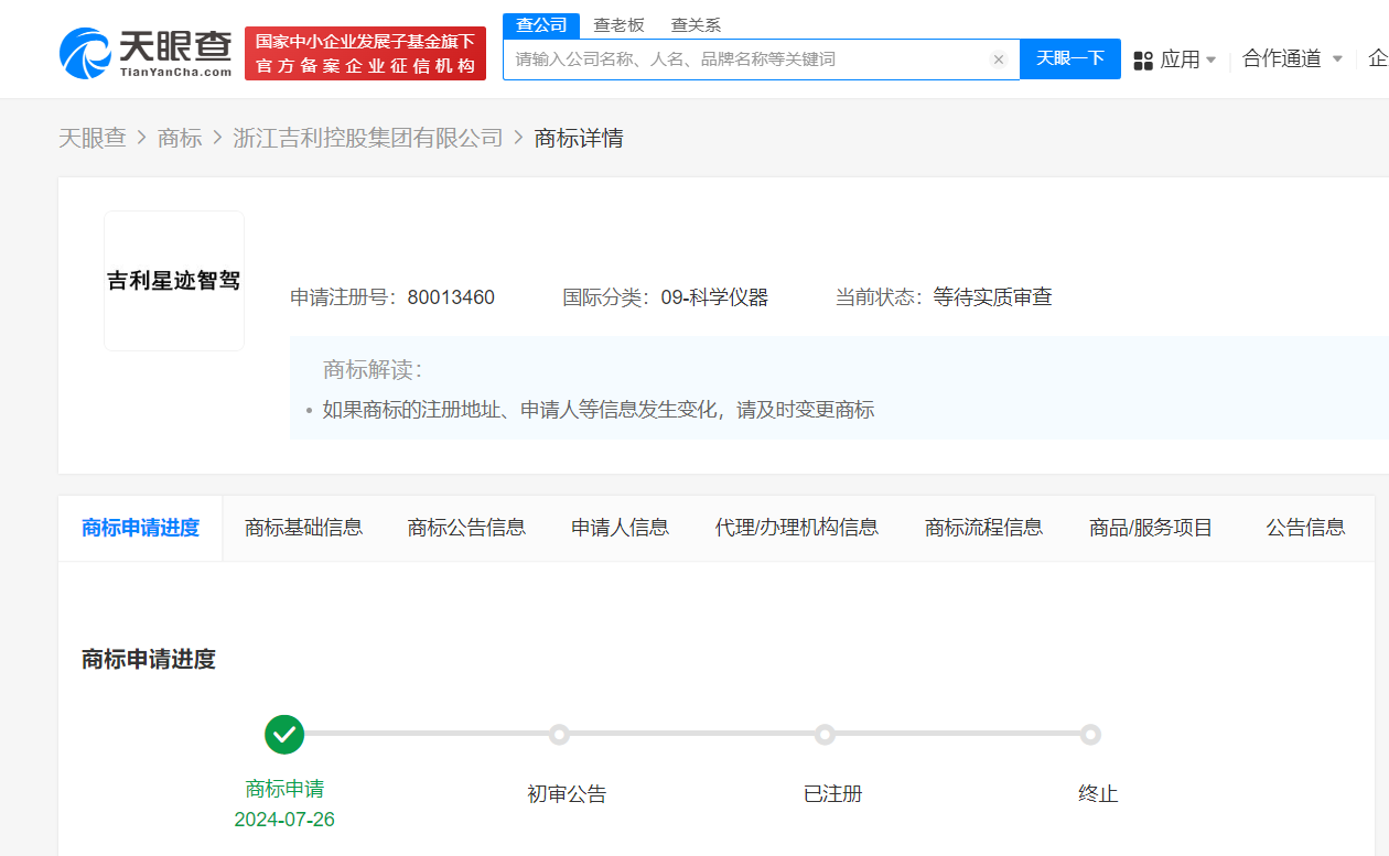 天眼查知识产权信息显示,近日,浙江吉利控股集团有限公司申请注册两枚“吉利星迹智驾”商标,国际分类为科学仪器、运输工具,当前商标状态均为等待实质审查。