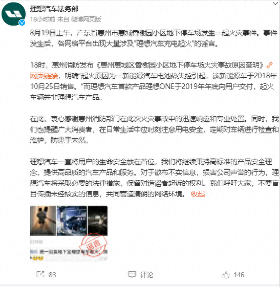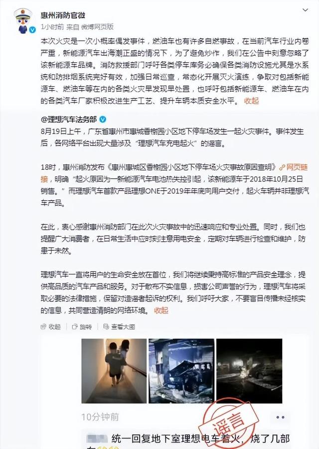 8月20日上午,惠州消防也针对@理想汽车法务部 的声明进行回应: