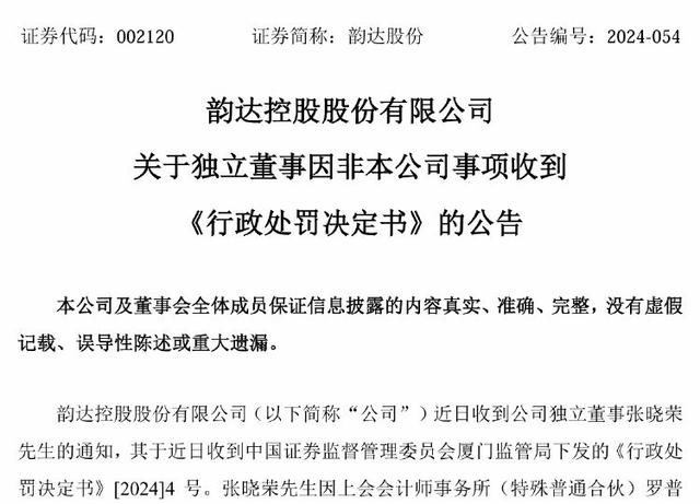 韵达股份表示,张晓荣先生自2023年1月以来担任公司独立董事,上述行政处罚事项与公司无关,不会对本公司的日常经营活动产生影响。