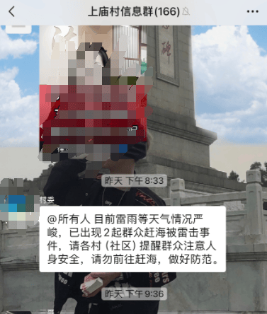 还有网友发布一张福成镇海陆村上庙村“村信息群”的群聊截图,有人提醒群友称,目前雷雨等天气情况严峻,已出现2起群众赶海被雷击事件,请各村(社区)提醒群众注意人身安全,请勿前往赶海,做好防范。