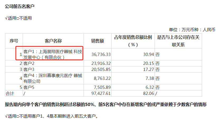 2023年,心脉医疗前五大客户中,客户1为上海展翔医疗器械科技发展中心(有限合伙),年内销售额为3.67亿元,占年度销售总额比例为30.94%。