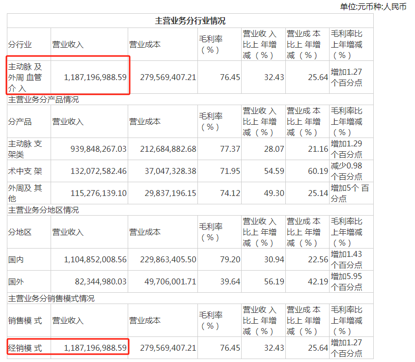 2023年,心脉医疗主动脉及外周血管介入营收为11.87亿元,通过经销模式的营收也为11.87亿元。这意味着该公司产品100%通过经销商向医院等终端出售。