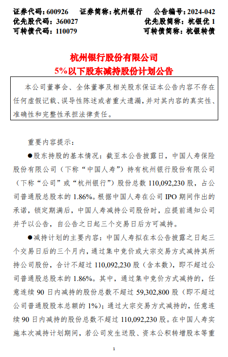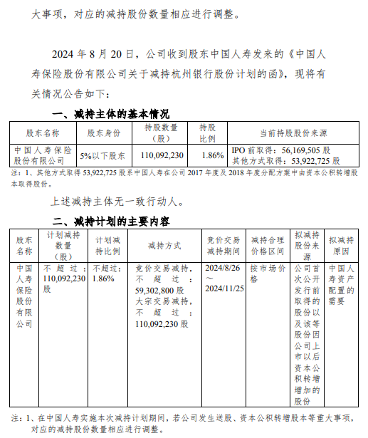 杭州银行8月20日公告,公司持股1.86%的股东中国人寿拟在公告披露之日起三个交易日后的三个月内,通过集中竞价或大宗交易方式减持其所持公司股份,合计不超过110,092,230股,即不超过公司普通股总股本的1.86%。