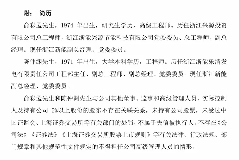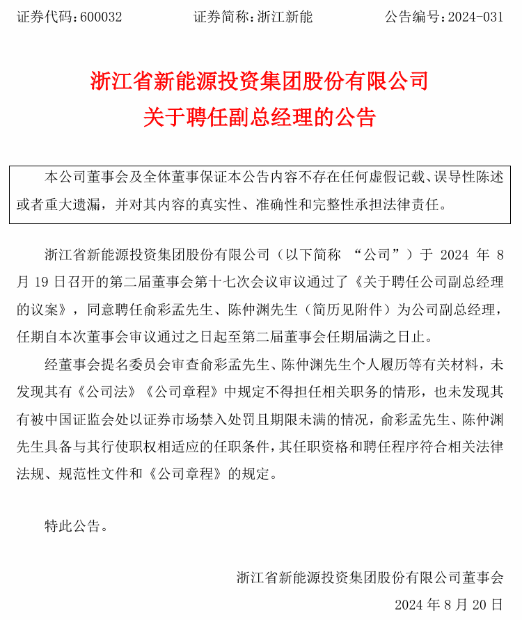 8月20日,浙江省新能源投资集团股份有限公司发布公告,公司8月19日召开的第二届董事会第十七次会议审议通过了《关于聘任公司副总经理的议案》,同意聘任俞彩孟先生、陈仲渊先生为公司副总经理,任期自本次董事会审议通过之日起至第二届董事会任期届满之日止。