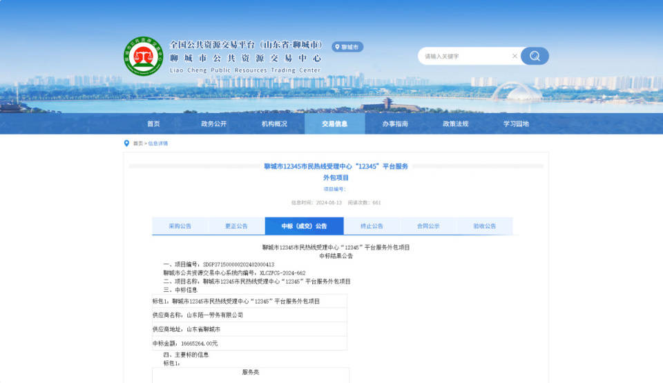 此后每年合同结束后,聊城市都会就此项目对外招标:2021年,预算为1400万元,中标金额为13959663元;2022年,预算为1673万元,中标金额为1669.361585万元;2023年,预算为1589万元,中标金额为15869550.00元。