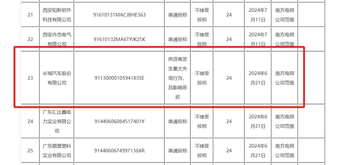 公告内容涉及的供应商一共有37家公司。相关表格中写到,长城汽车股份有限公司因“供货商发生重大失信行为,且影响恶劣”,被列为“不接受投标”。处理期限为24个月,处理措施起计时间为2024年6月21日,处理范围为“南方电网公司范围”。