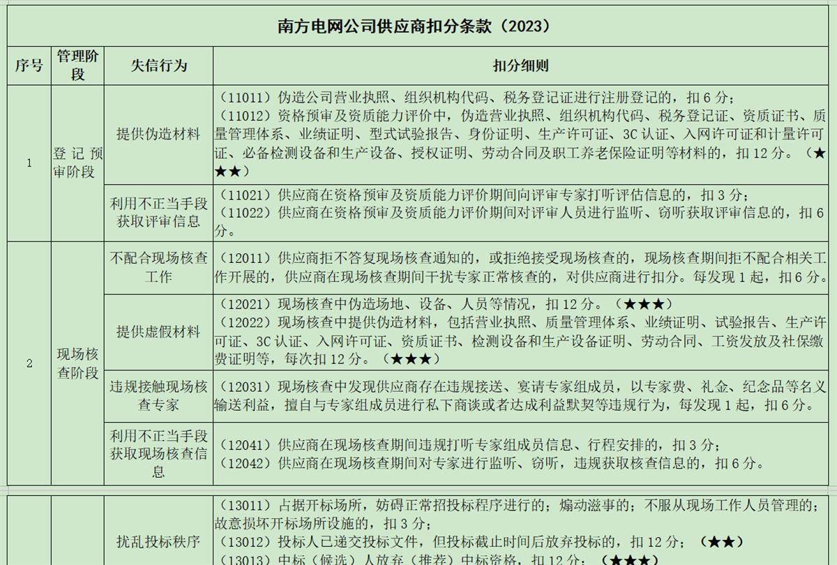 据极目新闻记者了解,南方电网公司供应商扣分条款中,相关扣分的失信行为包括伪造材料、破坏公平竞争、违规转包分包、供货质量不合格、产品运行缺陷等,每条款扣分从0.1分到12分不等。