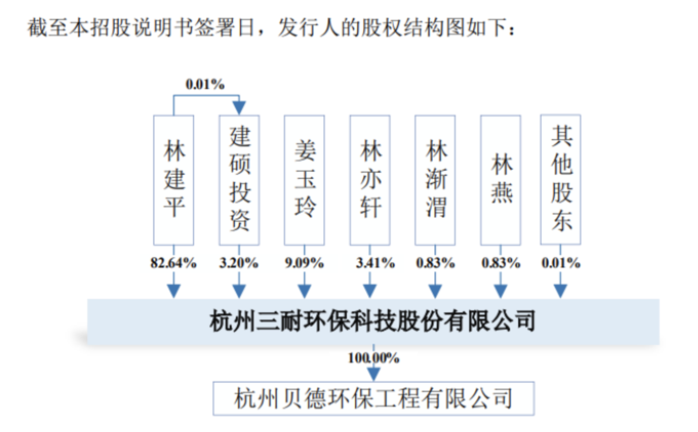 林建平为公司的控股股东,直接持有公司82.64%的股份,姜玉玲直接持有公司总股本的9.09%。林建平持有建硕投资0.01%的出资份额,系建硕投资执行事务合伙人,并通过建硕投资控制三耐环保3.20%的股份。林建平、姜玉玲夫妇及其一致行动人林亦轩、林渐渭合计控制公司99.17%的股份。