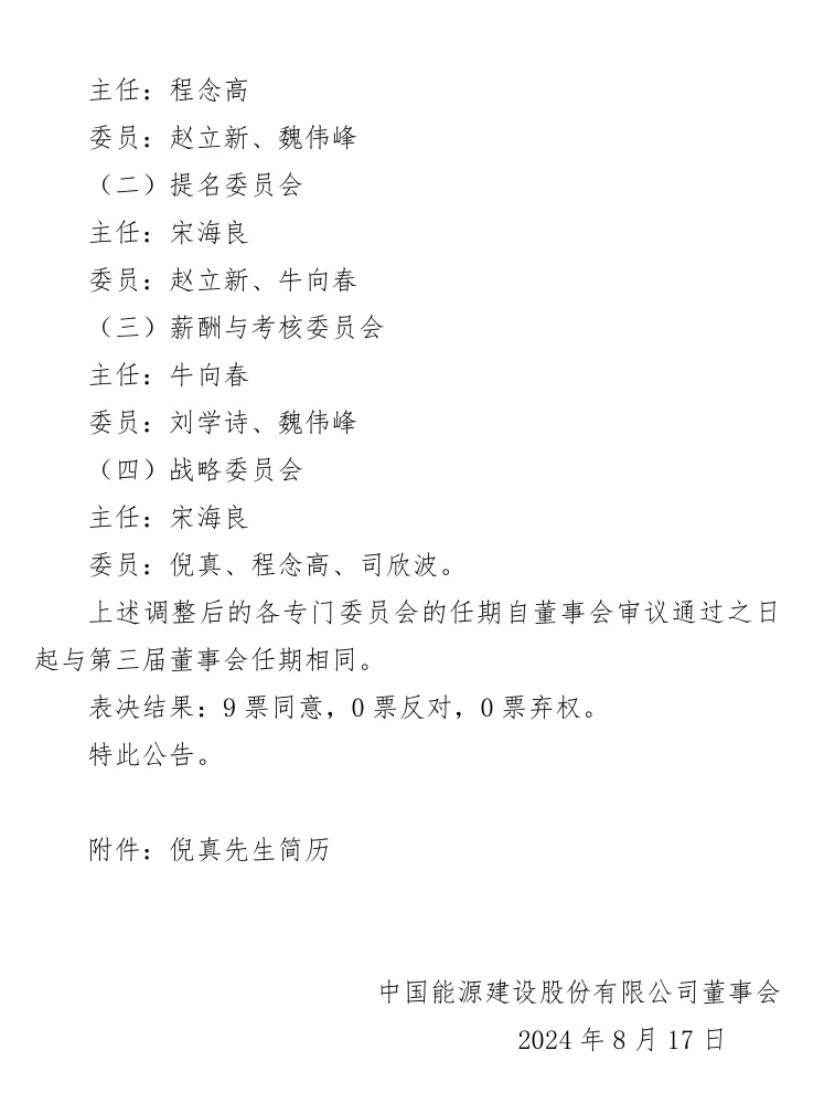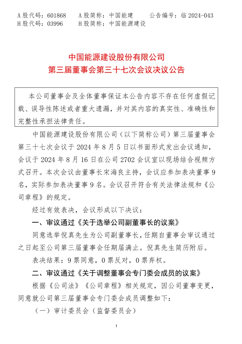8月17日,中国能建发布公告称,公司第三届董事会第三十七次会议于8月16日召开。会议审议通过《关于选举公司副董事长的议案》 ,同意选举倪真先生为公司副董事长,任期自董事会审议通过之日起至公司第三届董事会任期届满止。