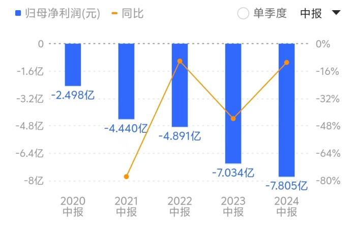 值得一提的是,自2020年以来,荣昌生物中报业绩已连续五年亏损,且亏损规模呈进一步扩大趋势。