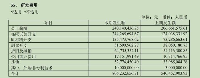 来源:荣昌生物半年报首先来看研发费用。今年上半年荣昌生物累计研发支出达8.06亿元,较去年同期增加近2.66亿元。其中,员工薪酬、临床实验开支、原材料开支、测试开支、外购非专利技术等均大幅增加。