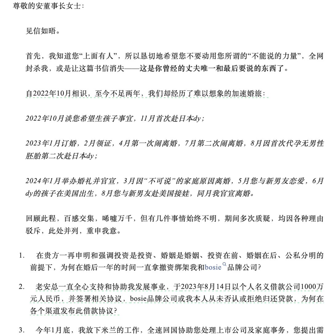 据蓝鲸财经,公开信发布前日即8月15日,安吉向外界散布了一则《借款协议》,并称“我给了刘光耀5000w投资款,给了他父母400w买房,刘光耀的公司bosie欠我1000w,至今未归还”。《借款协议》显示,甲方为信邦制药前董事长、安吉之父安怀略,乙方为杭州伯喜服饰有限公司(以下简称“杭州伯喜”)。协议显示,2023年8月14日至2024年8月14日期间,伯喜服饰向安怀略借款1000万元,用于企业日常经营。