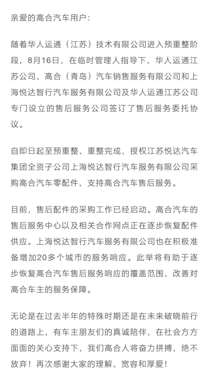 8月19日消息,高合汽车发布售后服务公告。公告称,自即日起至预重整、重整完成,授权江苏悦达汽车集团全资子公司上海悦达智行汽车服务有限公司采购高合汽车零配件,支持高合汽车售后服务。目前,售后配件的采购工作已经启动。高合汽车的售后服务中心以及相关合作网点正在逐步恢复配件供应。