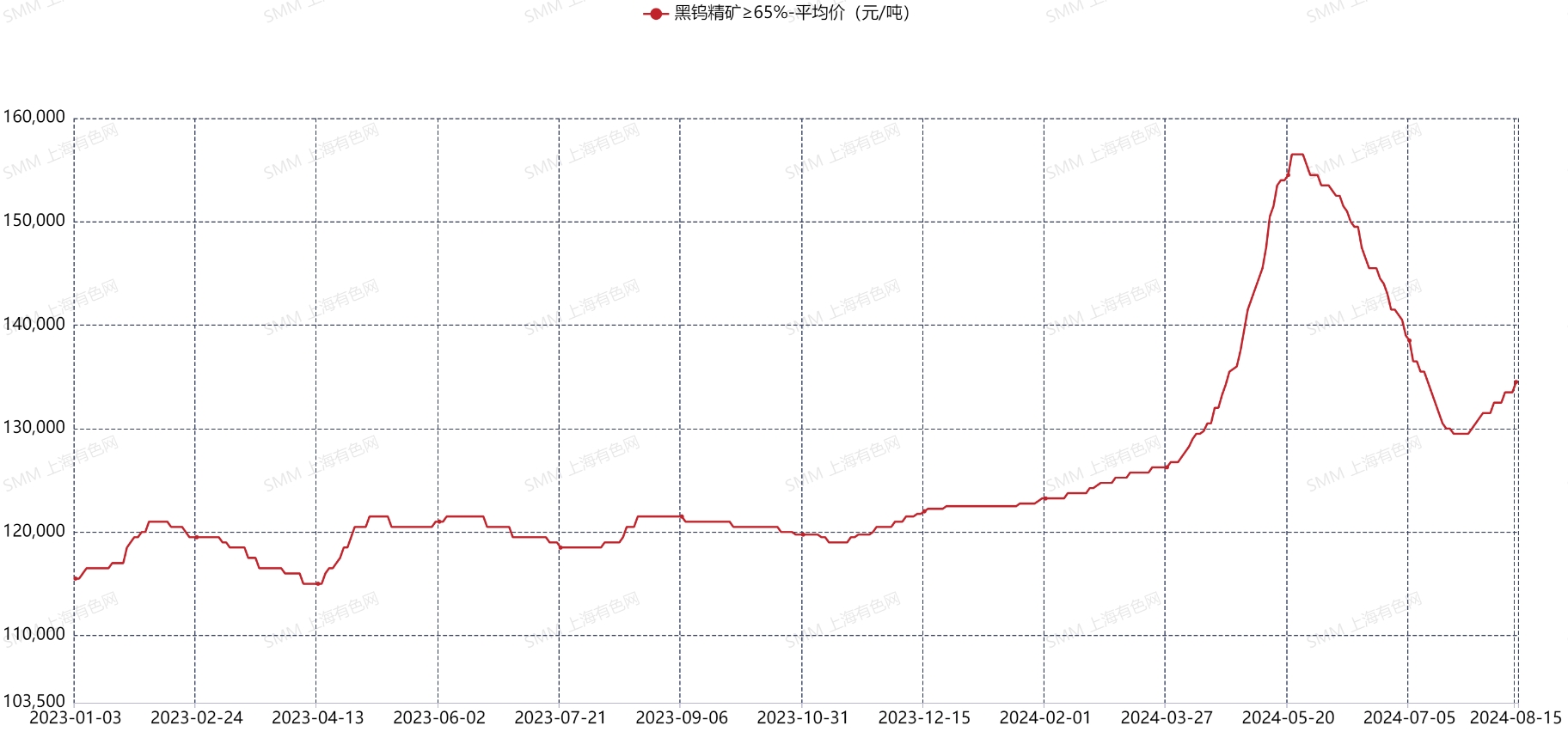 今年以来,钨价大起大落。行业数据显示,5月底时,黑钨精矿(品位≥65%)价格(下称“钨价”)一度站上15.8万元/吨,为近十年新高;此后,钨价掉头向下,在7月底时跌破13万元/吨,回吐超八成涨幅;随后再次拉涨,截至8月16日,钨价为13.55万元/吨,月内涨幅超5%。