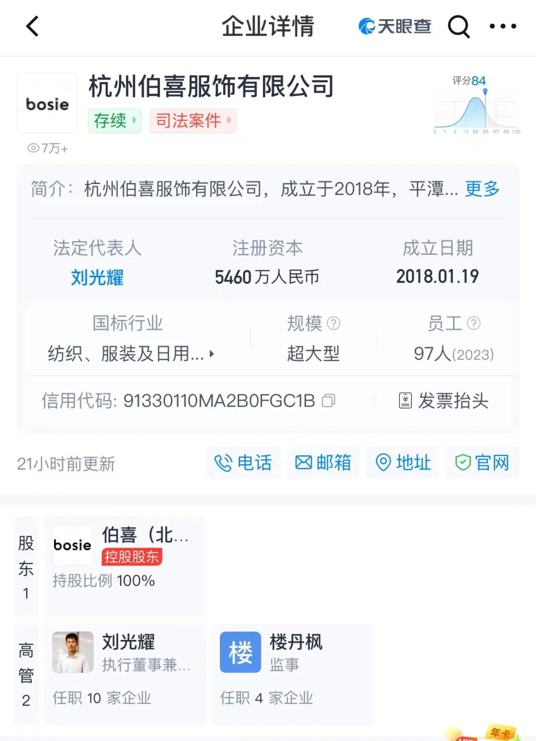 2018年,他创立了无性别服饰品牌bosie(伯喜),品牌官网显示,目前伯喜在全国拥有24家门店。