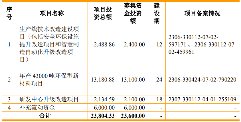 潜阳科技原拟募集资金23,600.00万元,用于生产线技术改造建设项目(包括安全环保设施提升改造项目和智慧制造自动化升级改造项目)、年产43000吨环保型新材料项目、研发中心升级改造项目、补充流动资金。
