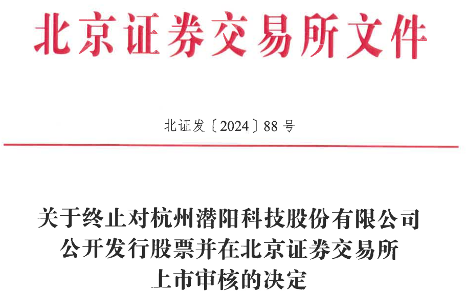 北交所于2023年12月14日受理了潜阳科技提交的公开发行相关申请文件,并按照规定进行了审核。2024年6月28日,潜阳科技向北交所提交了《杭州潜阳科技股份有限公司关于撤回杭州潜阳科技股份有限公司向不特定合格投资者公开发行股票并在北交所上市项目申请文件的申请》。根据《北京证券交易所向不特定合格投资者公开发行股票并上市审的有关规定,北交所决定终止潜阳科技公开发行股票并在北京证券交易所上市的审核。