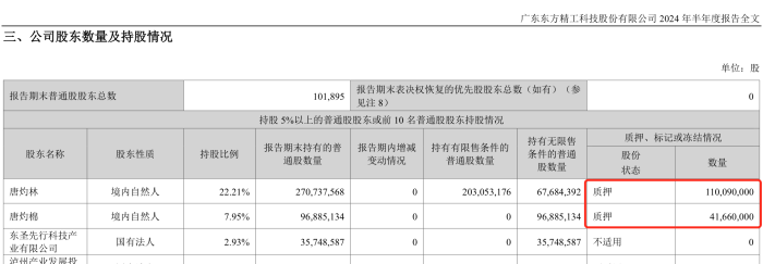 来源:交易所不过值得一提的是,百胜动力实际控制人为唐灼林、唐灼棉,双双质押了东方精工的股份,2024年半年报显示,两人分别质押了1.1亿股和4166万股。