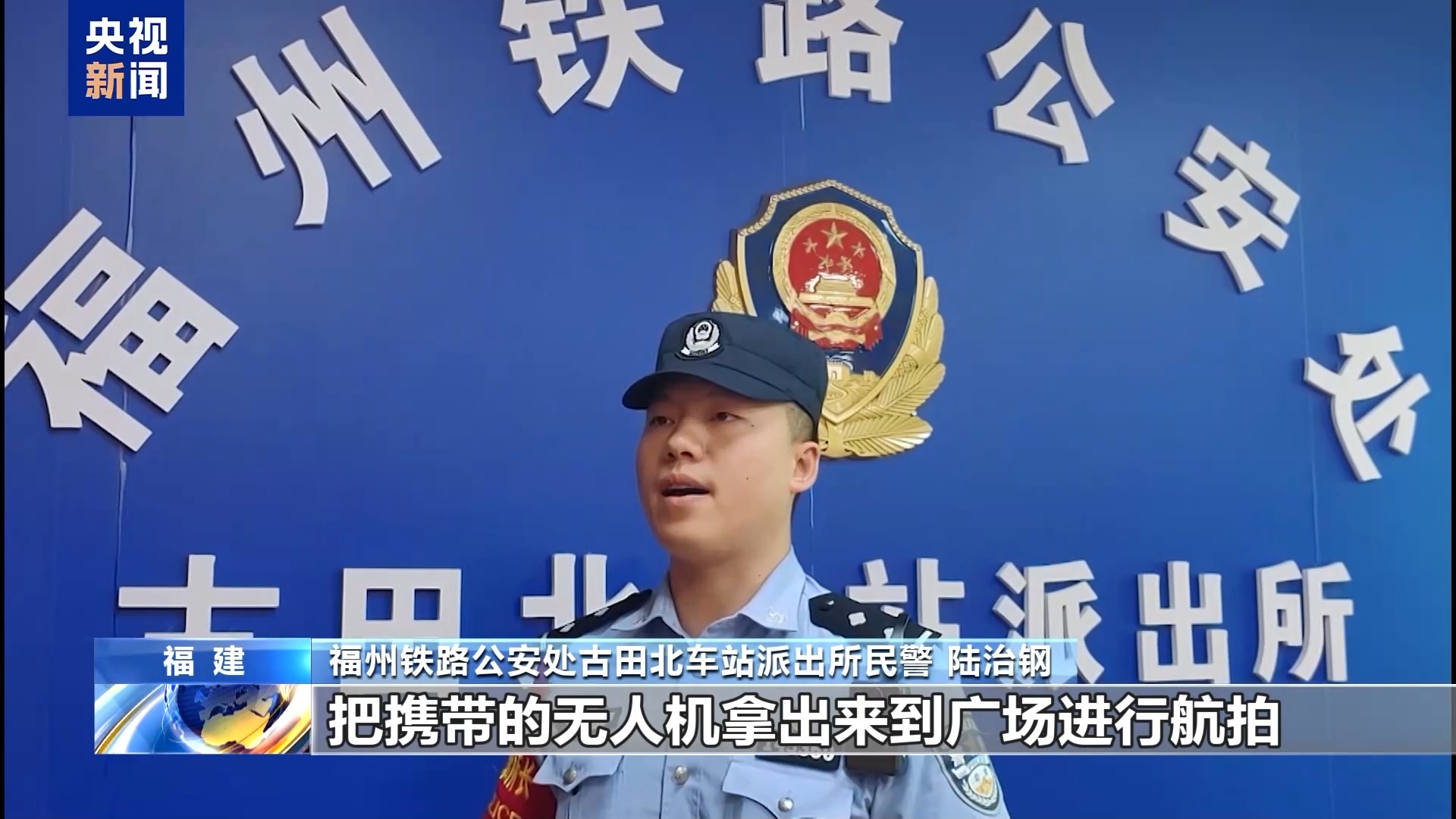 福州铁路公安处古田北车站派出所民警陆治钢:当时这名男子要到古田北站接亲友,在等待期间他就从车上把携带的无人机拿出来到广场进行航拍。当时无人机已经离电气化铁路线路导线两侧最近的地方不足100米,存在安全隐患。