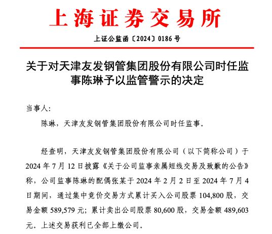 上交所称,经查明,友发集团于2024年7月12日披露《关于公司监事亲属短线交易及致歉的公告》称,公司监事陈琳的配偶张某于2024年2月2日至2024年7月4日期间,通过集中竞价交易方式累计买入公司股票104,800股,交易金额589,579元;累计卖出公司股票80,600股,交易金额489,603元。上述交易获利已全部上缴公司。