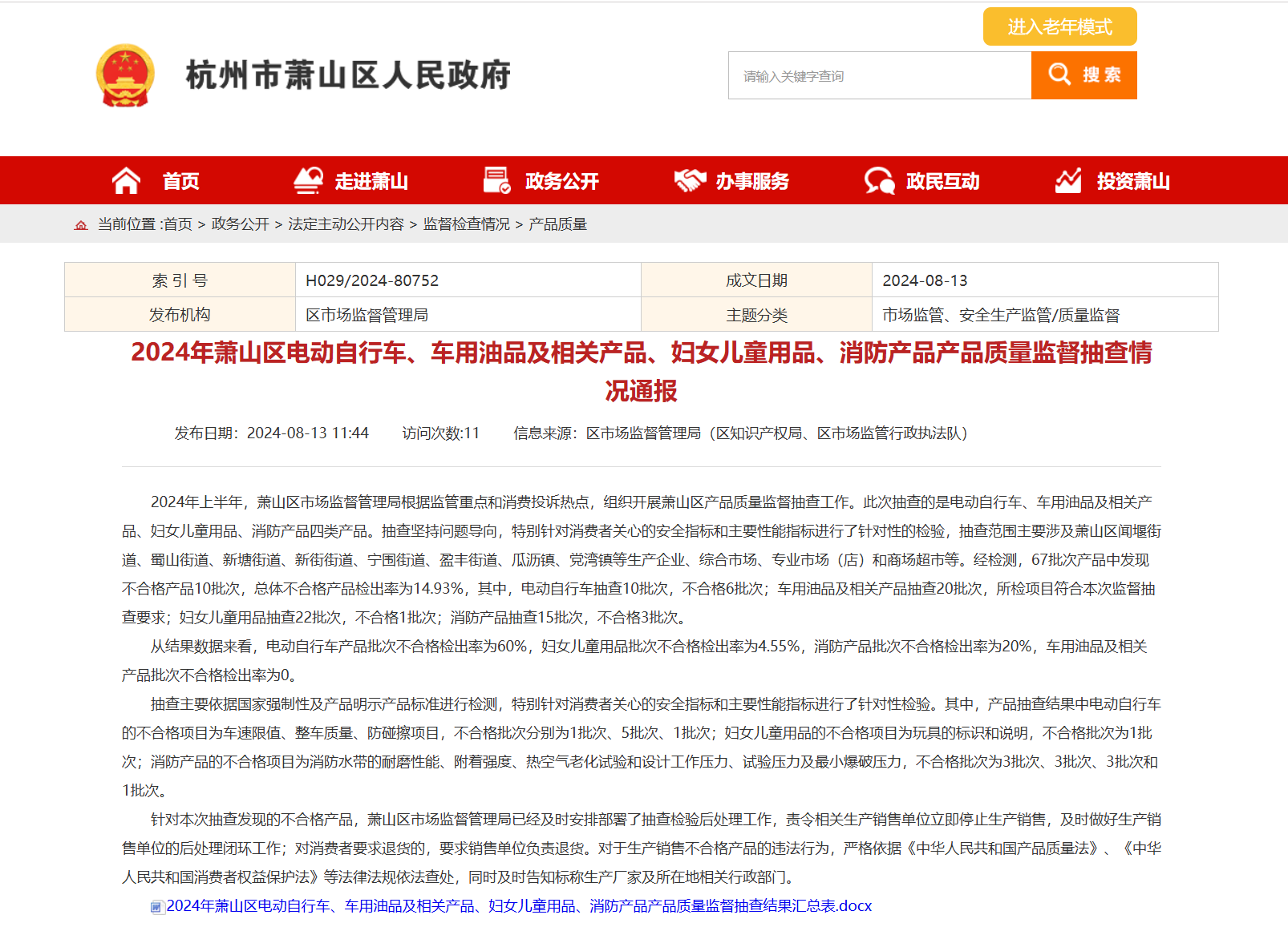 8月13日,杭州市萧山区人民政府网站发布2024年萧山区电动自行车、车用油品及相关产品、妇女儿童用品、消防产品产品质量监督抽查情况通报。