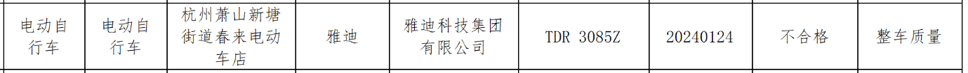 其中,“雅迪”、“阿尔法”、“小刀”、“绿驹”等5批次产品,整车质量项目不符合规定;“骑安达”的一批次产品,防碰擦项目不符合规定;“酷千里”的一批次产品,车速限值项目不符合规定。