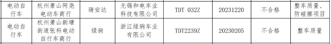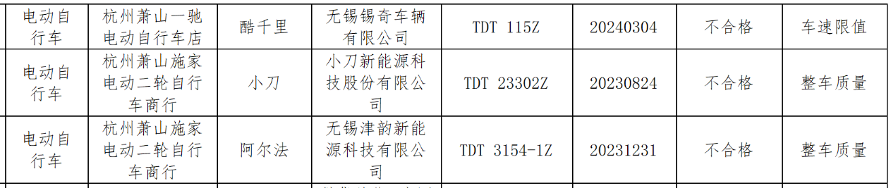 通告显示,电动自行车抽查10批次,不合格6批次,不合格原因为整车质量、防碰擦项目、车速限值。