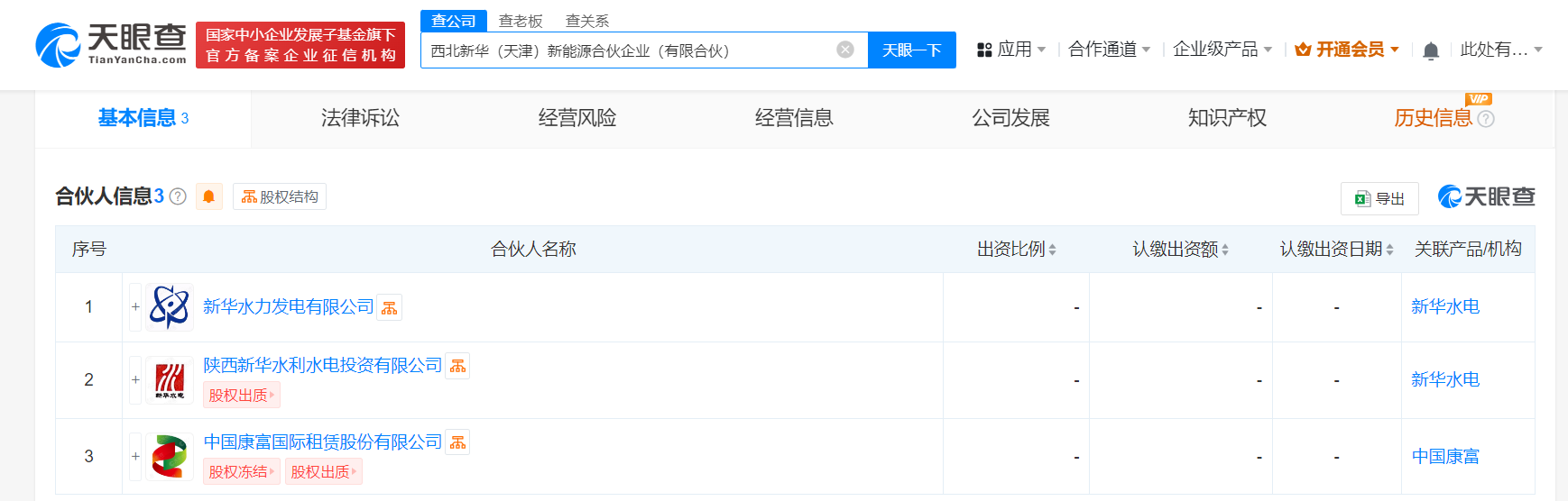 天眼查App显示,近日,西北新华(天津)新能源合伙企业(有限合伙)、华东新华(天津)新能源合伙企业(有限合伙)成立,执行事务合伙人分别为陕西新华水利水电投资有限公司、华东新华能源投资有限公司,出资额分别为36.97亿人民币、28.96亿人民币,经营范围均为节能管理服务、发电技术服务、风力发电技术服务、太阳能发电技术服务。合伙人信息显示,两家合伙企业由新华水力发电有限公司、中国康富(833499),及各自的执行事务合伙人共同出资。