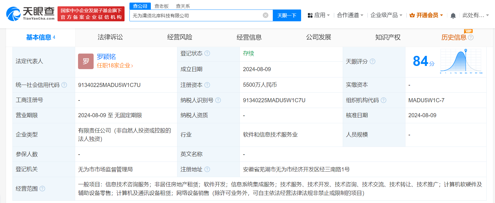 天眼查App显示,近日,无为濡须北岸科技有限公司成立,法定代表人为罗颖铭,注册资本5500万人民币,经营范围含信息技术咨询服务、非居住房地产租赁、软件开发、信息系统集成服务、计算机软硬件及辅助设备零售、网络设备销售等,由北京字跳网络技术有限公司全资持股。