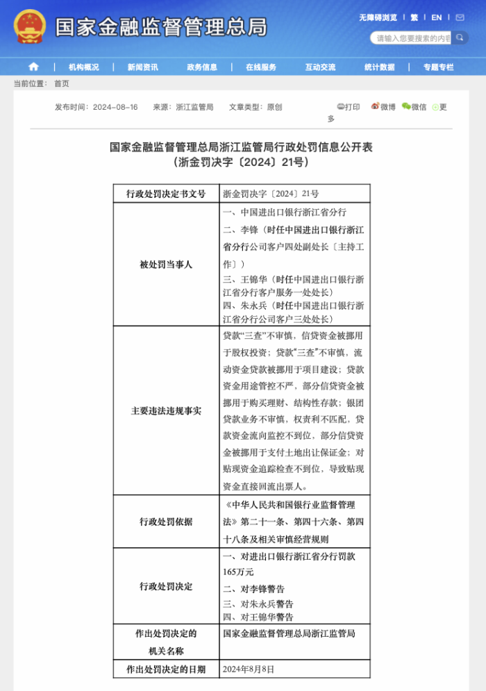 8月16日,国家金融监督管理总局浙江监管局行政处罚信息公开表显示,中国进出口银行浙江省分行被罚165万元。主要违法违规事实包括:贷款“三查”不审慎,信贷资金被挪用于股权投资;贷款“三查”不审慎,流动资金贷款被挪用于项目建设;贷款资金用途管控不严,部分信贷资金被挪用于购买理财、结构性存款;银团贷款业务不审慎,权责利不匹配,贷款资金流向监控不到位,部分信贷资金被挪用于支付土地出让保证金;对贴现资金追踪检查不到位,导致贴现资金直接回流出票人。