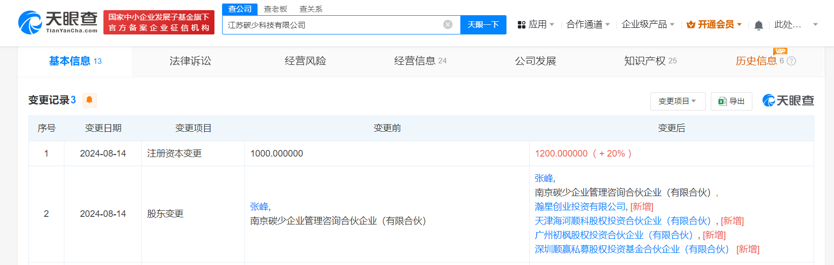 天眼查App显示,近日,江苏碳少科技有限公司发生工商变更,新增小米旗下瀚星创业投资有限公司,以及顺为资本旗下天津海河顺科股权投资合伙企业(有限合伙)、广州初枫股权投资合伙企业(有限合伙)、深圳顺赢私募股权投资基金合伙企业(有限合伙)为股东,同时注册资本由1000万人民币增至1200万人民币。