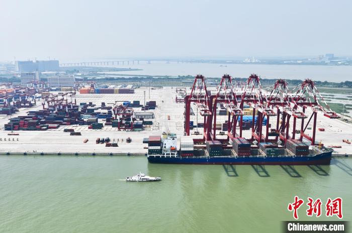 中新社广州8月15日电 (郭军 朱杰)大型集装箱船“华晟69”15日在广州港南沙港区四期全自动化码头仅用半天时间,就完成了2400标箱的装卸作业。