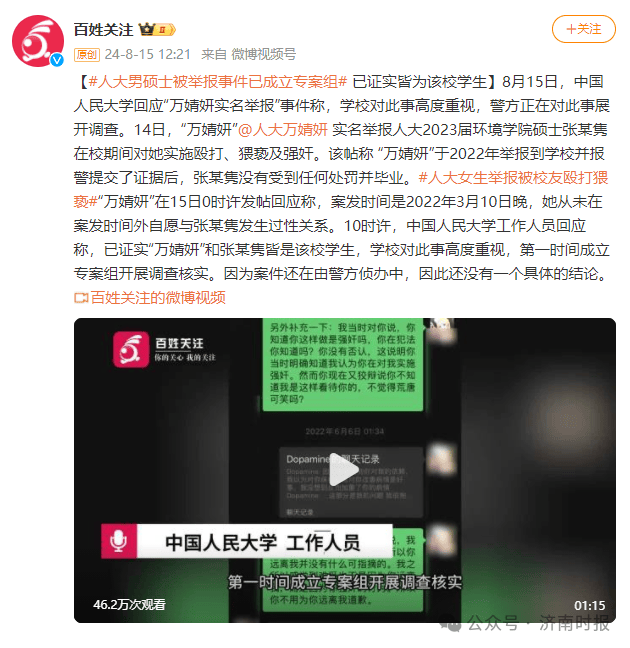 另据百姓关注,今天10时许,中国人民大学工作人员回应称,已证实万某某和张某某皆是该校学生,学校对此事高度重视,第一时间成立专案组开展调查核实。万某某发布举报文章后,校方也与万某某展开沟通并对其安抚。