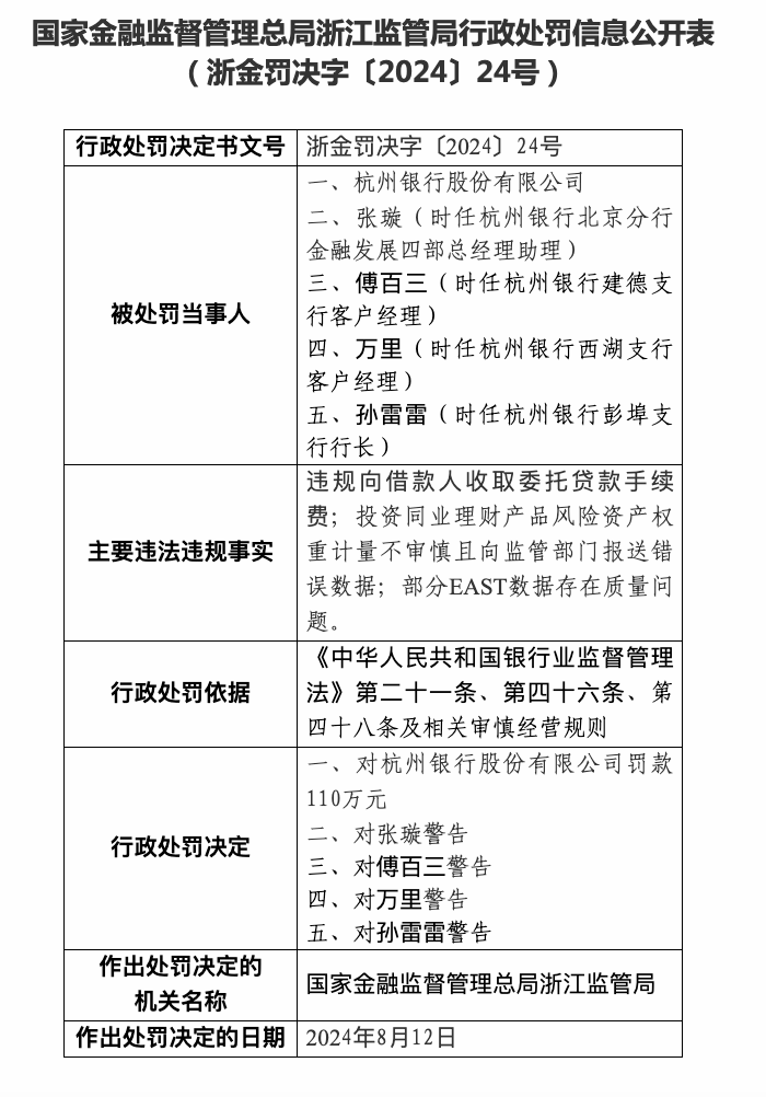 国家金融监督管理总局浙江监管局网站显示,杭州银行被罚110万元,该行主要涉及违规向借款人收取委托贷款手续费;投资同业理财产品风险资产权重计量不审慎且向监管部门报送错误数据;部分EAST数据存在质量问题等违法违规行为。