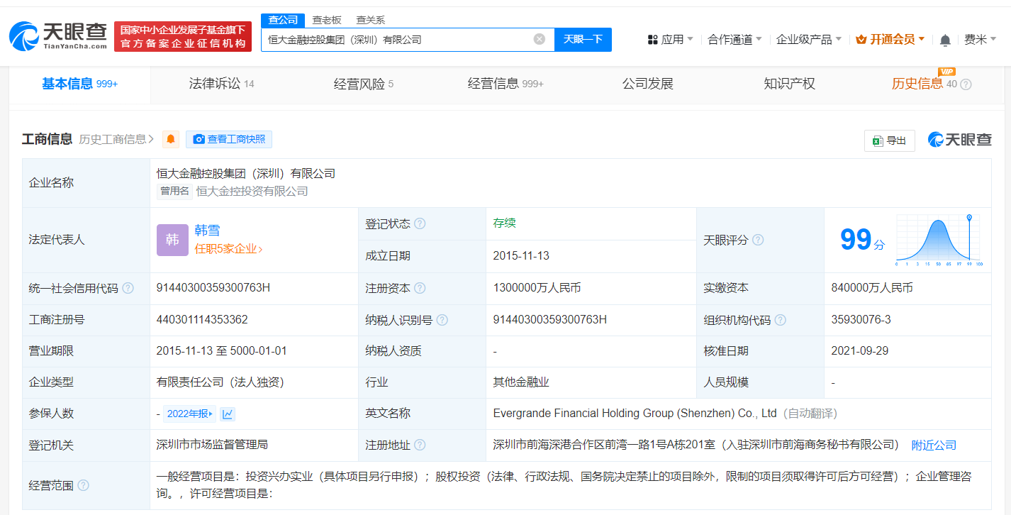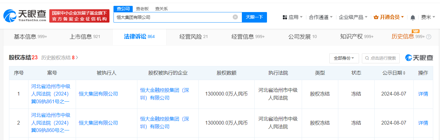 天眼查法律诉讼信息显示,近日,恒大集团有限公司新增股权冻结信息,股权被执行的企业为恒大金融控股集团(深圳)有限公司,冻结股权数额为130亿元,执行法院为河北省沧州市中级人民法院。