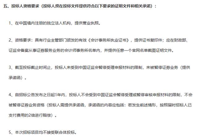 此次招标对投标人提出了5条门槛要求,除了常规的资格要求外,其中第4条引发市场关注。该要求为,自招标公告发布之日起1年内,投标人不会受到中国证监会暂停受理或暂停审核申报材料的限制,不会被暂停证券业务资格(投标人需提供承诺函,承诺函的内容应包括:若发生前述情形,按照届时招标人已支付费用的两倍进行赔偿)。