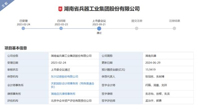 据深交所官网,湖南兵器主板IPO项目于2023年2月获深交所受理,2023年9月21日通过了上市委会议审核。保荐机构为东兴证券,会计师事务所为天职国际。目前过会接近一年时间,该IPO暂未获得提交注册。