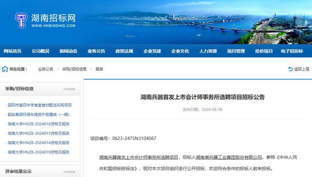 8月8日,湖南招标网发布了一份《湖南兵器首发上市会计师事务所选聘项目招标公告》。湖南兵器选聘公司首发上市会计师事务所,招标的期限要求为合同签订之日至湖南兵器募集资金到位并上市交易。