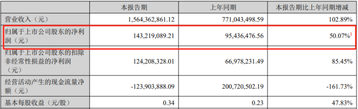 大族数控8月14日晚间公告,公司上半年实现营业收入15.64亿元,同比增长102.89%;实现归属于上市公司股东的净利润1.43亿元,同比增长50.07%。