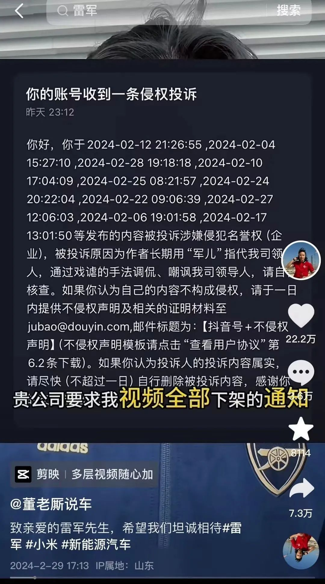 “董老厮说车”提到,小米整体肯定了正向性的创作,也欢迎他们再创作,而对“军儿”视频的下架是对平台上的所有抹黑视频进行了同样操作,并不是针对“董老厮说车”。