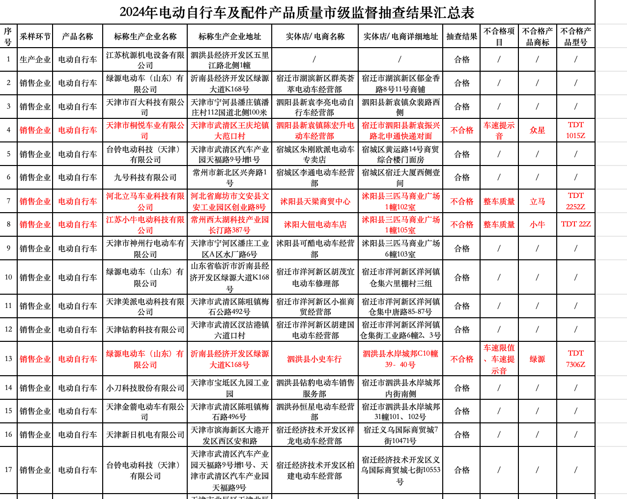 近期,宿迁市市场监督管理局公布了一则电动自行车及配件产品质量市级监督抽查结果的通告,具体情况如下。