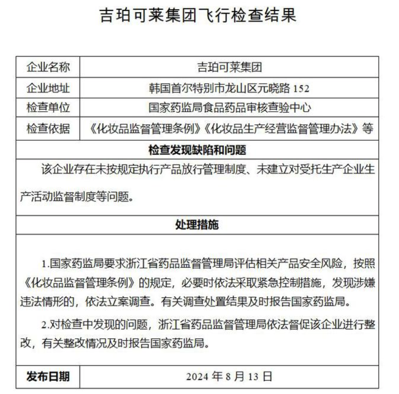 8月13日,国家药监局网站披露吉珀可莱集团飞行检查结果。检查发现,该企业存在未按规定执行产品放行管理制度、未建立对受托生产企业生产活动监督制度等问题。
